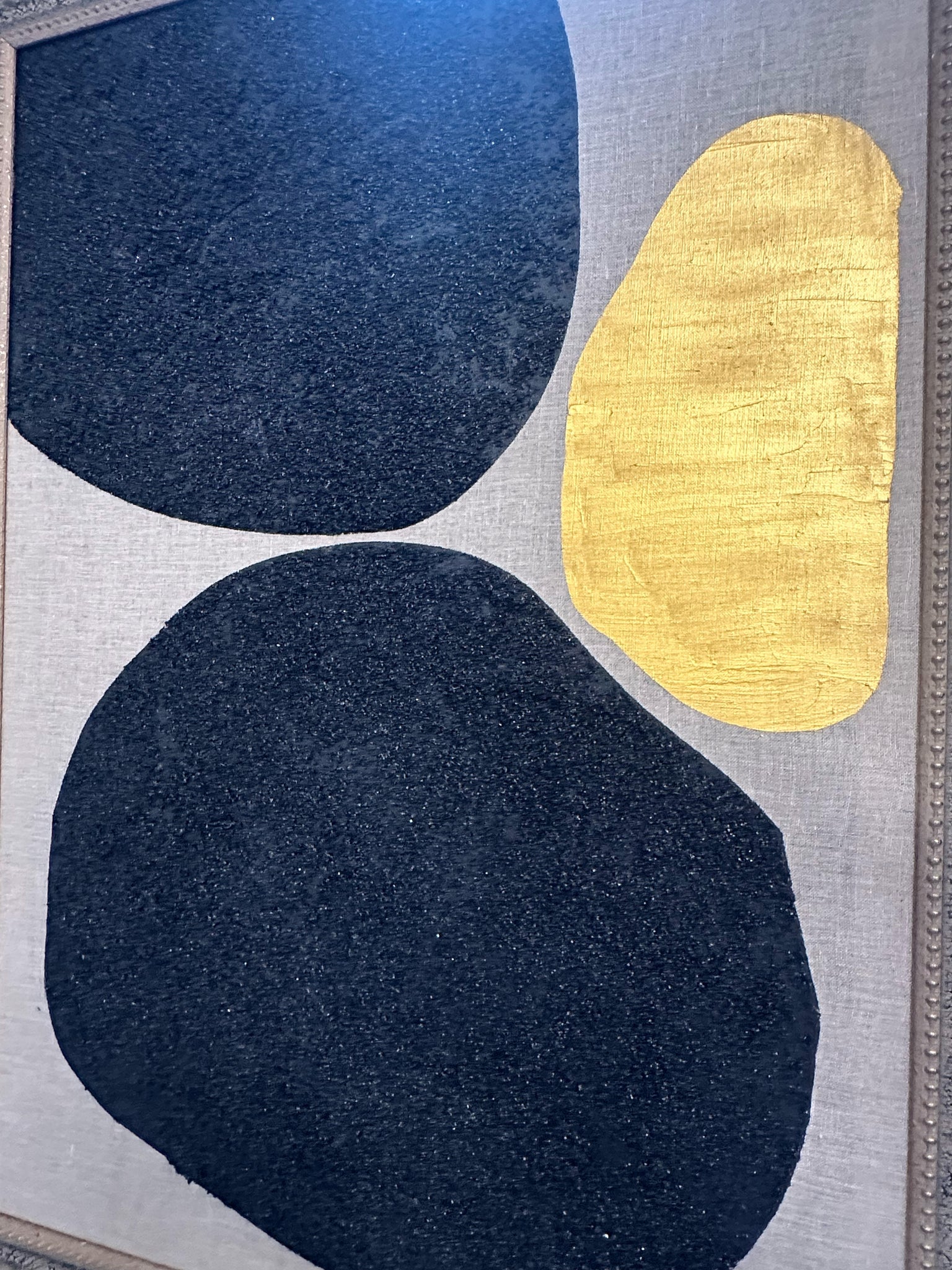 This "found and collected" frame commands attention with its imposing presence and opulent finishes. The substantial structure, steeped in traditional design, boasts a resplendent oil-based metallic gold surface that catches and reflects light with understated brilliance. Intricate jet-black detailing, meticulously applied in a crusted texture, weaves across the golden canvas, creating a striking chiaroscuro effect. This juxtaposition of light and dark, smooth and textured, evokes the drama and grandeur of historical art periods.